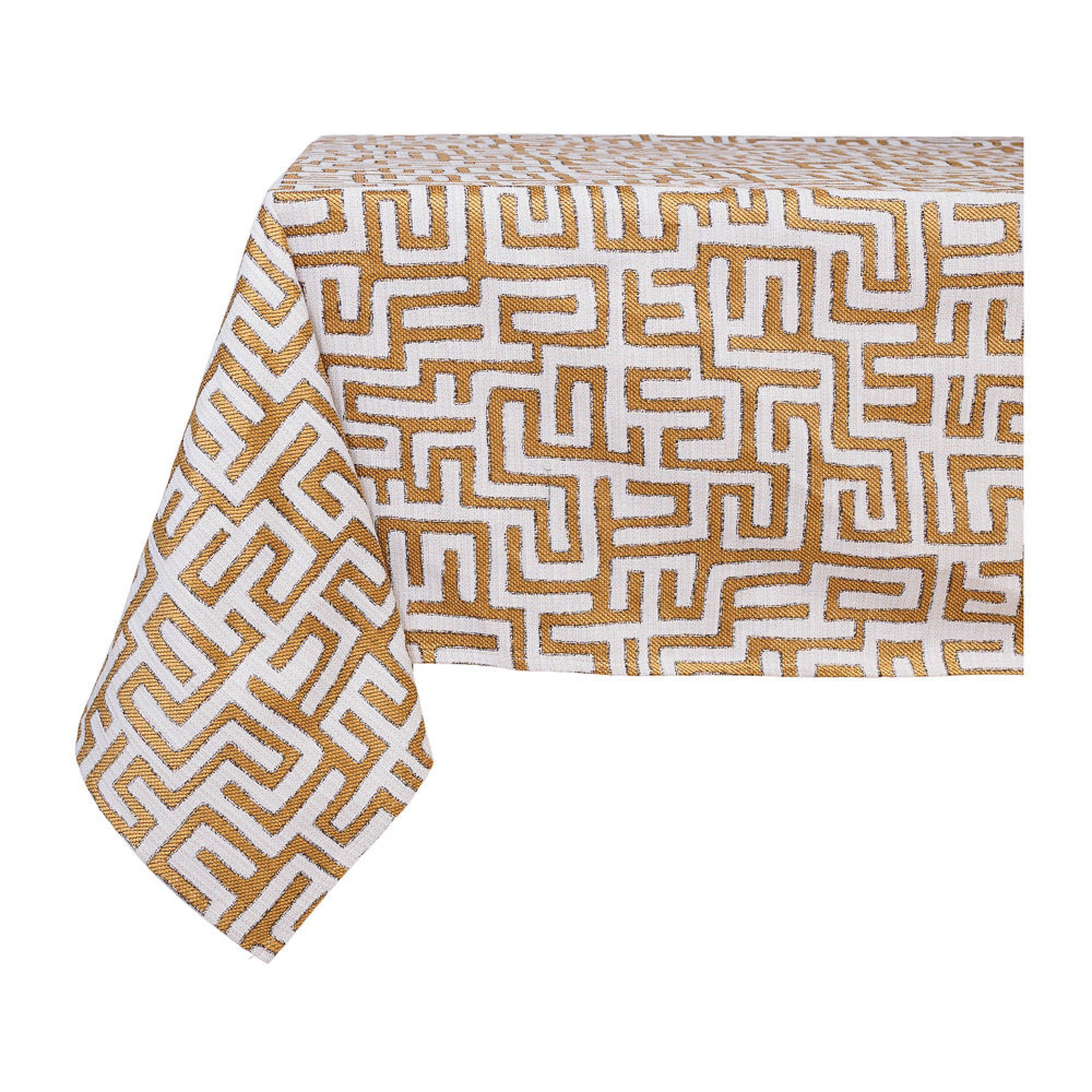 Βαμβακερό Τετράγωνο Τραπεζομάντηλο Με Μαίανδρους 400x400 cm Σε Λευκό-Κίτρινο Χρώμα | Κλασική Αρχοντιά με Μοντέρνα Λάμψη